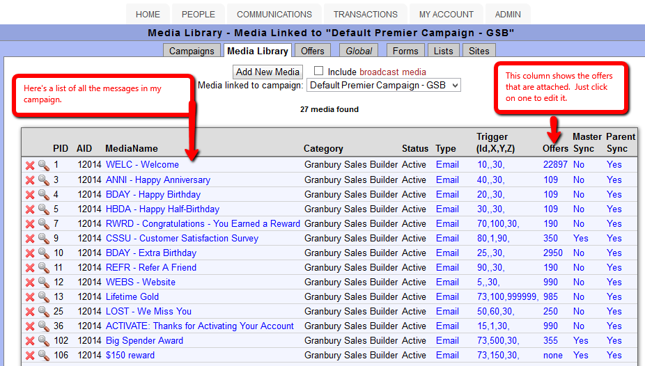 - For each campaign message, you'll see which offer is associated with it in the "Offers" column. Click on the offer number (or none) to manage these offers.